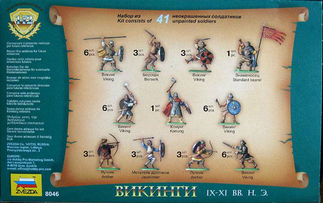 Викинги наводили ужас на всю Европу своими стремительными и беспощадными набегами. Вооружение викингов было очень разнообразным: это топоры, мечи, копья обычные и метательные, луки. На Древней Руси они были известны под именем Варяги. Варяжские дружины были опорой русских князей. Из викингов же набирали Вангардов - элитную дворцовую стражу византийских императоров. Набегам викингов подвергались Англия и Ирландия, Франция и Северная Германия, Пиренейский полуостров и Южная Италия, даже Византия и Восточная Европа узнали всю жестокость скандинавов. Набор может быть использован как составная часть игровой системы "Эпоха битв". Каждая фигурка соответствует реальному историческому воину со свойственными ему характеристиками.