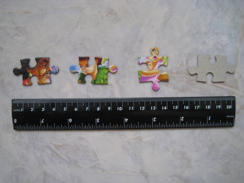 Пазлы отличного качества. Размер деталей - примерно 2,5х2,5 см. Картинка получается размером с лист А4 (альбомный). Несмотря на большое количество деталей, собирается легко, т.к. детали рисунка - крупные и контрастные.