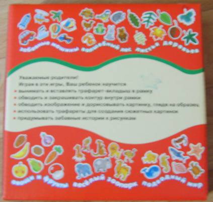 Отличный игровой материал. Мы начали использовать с 1,5 лет. Дочка сначала находит предмет, потом вставляет сама в трафарет. И интересно, и полезно. Проблема одна - при неоднократном использовании картон гнется.