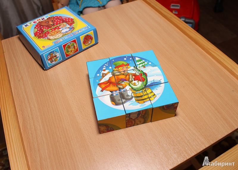 Кубики с любимыми детскими сказками. Удобно, что цветной фон, деткам до 3 лет проще собрать. Картинка наклеена плотно. Довольны покупкой!