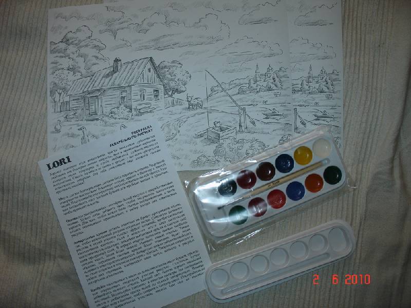 В наборе: акварельные краски - 12 цветов, бумажная основа с нанесенным черно-белым рисунком - 2 шт., кисть, палитра, инструкция.
