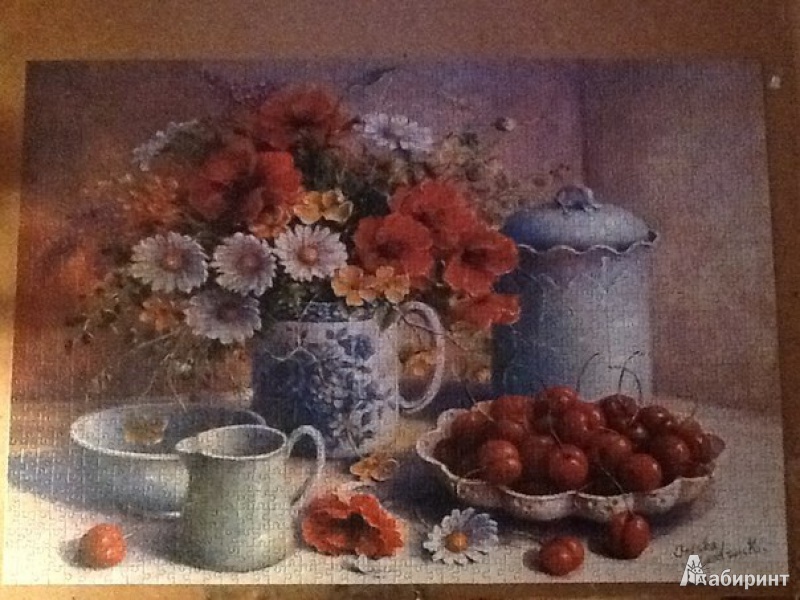 Великолепная картина, вызывающая восхищение и удивление известной художницы Тришы Хардвик. Очень приятно было собирать натюрморт с вишенками! Я бы не сказала что он сложный (детальки сортируются хорошо). В планах собрать "Малиновое варенье" на 3000 деталекю Тем более что букет маков с вазой там этот же и рук...