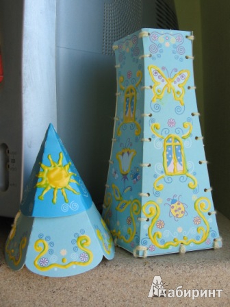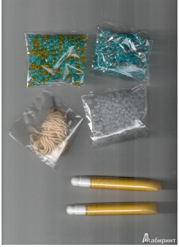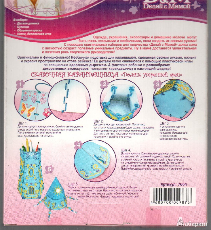 В набор входит: картонные детали для домика, нитки, безопасная игла, 3 вида бусин, 2 тюбика объемной краски, инструкция.