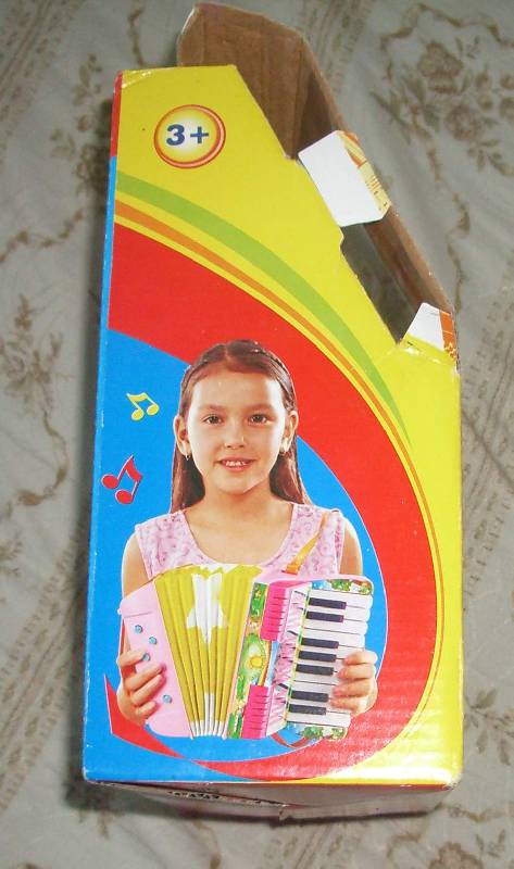 гармошка упакована в коробку, дочки 1.8,получается, немножко играть на ней, гармошка яркая, кнопки и клавиши легко нажимаются, звучит гармошка нормально не тихо, ни громко. Из минусов это очень неприятный запах, со дня покупки гармошка лежала на балконе думала выветрица, но прошло больше двух недель, а запах остался....