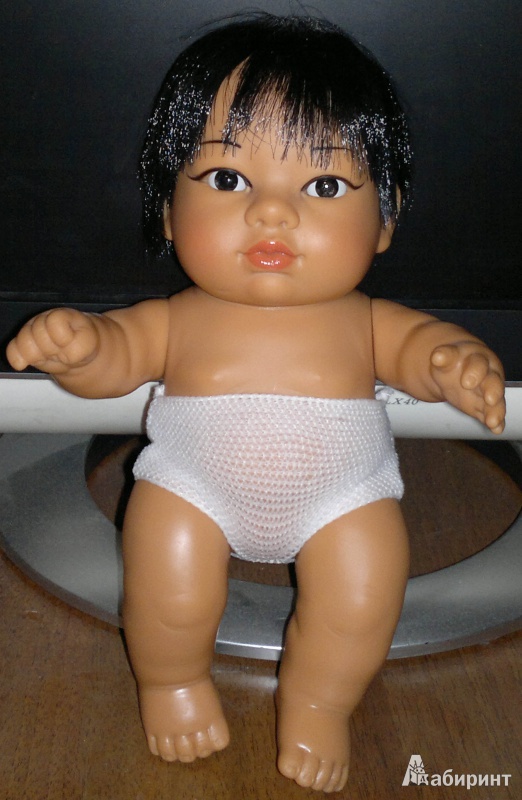 Очень приятный небольшой пупсик. Ручки с ножками двигаются, может сидеть и тянуть ручонки вперёд и вверх, головка поворачивается. Личико рельефное, живое, с характером, волосы шелковистые, вшиты на значительном участке головы, то есть лысин нет, пальцы на руках и ногах тоже натуралистично сделаны. Кукла без запаха. Ко...