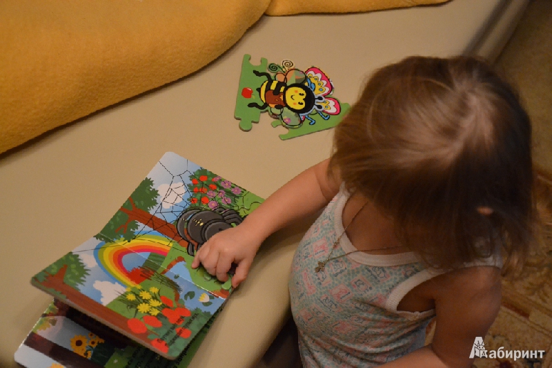 Замечательная книжка! В 1 год и 2 месяца у ребёнка получается, угадывает куда какую картинку поставить. Качественное оформление: - толстый картон, не мнётся и не гнётся; - картинки яркие, легко узнаваемые, 5 насекомых (божья коровка, кузнечик, паук, бабочка и пчела); - страницы легко переворачиваются, пазлы пока ...
