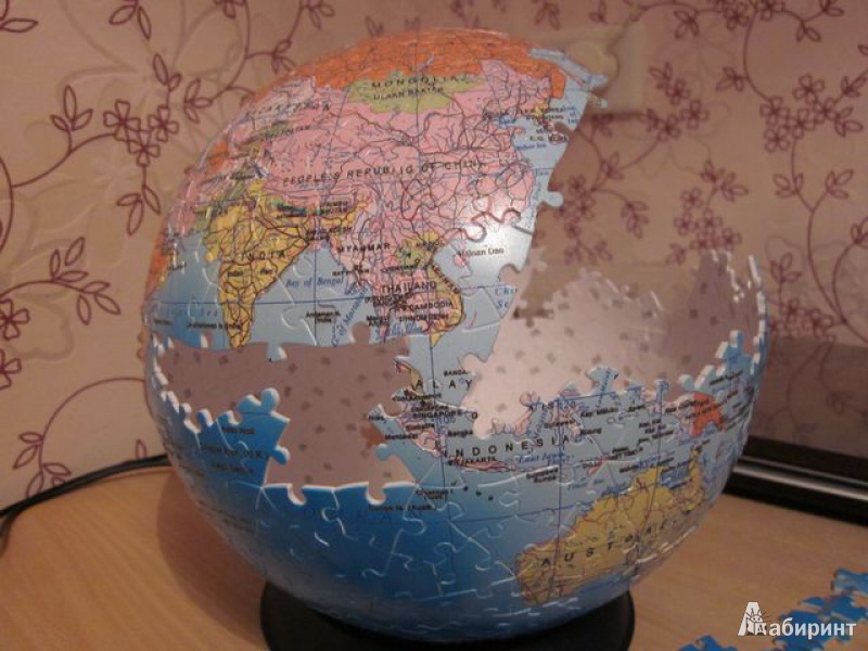Очень красивый пазл "Глобус" - земной шар с политической картой мира, диаметром 23 см. Надписи нанесены латиницей. Инструкция простая и понятная, нанесена на коробке. В состав набора входит и подставка, которой, при желании, можно выравнивать поверхность шарового пазла во время сборки, слегка надавливая руко...
