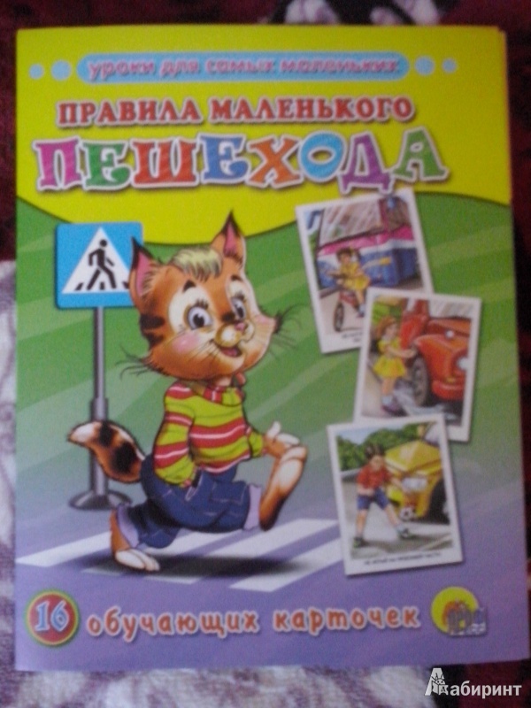 В наборе 16 познавательных карточек из плотного картона с очень яркими рисунками, которые помогут родителям и педагогам объяснить и показать правила маленького пешехода.