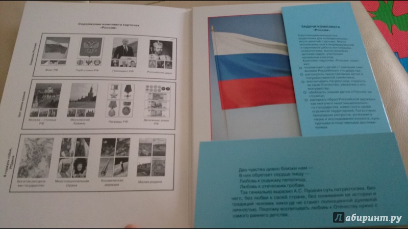 Честно говоря , ожидала от комплекта большего. Не понравилось то, что в карточках не говорится, что на них изображено. К примеру карточку с изображением президентов не сложно пояснить, а вот для того что бы пояснить ребенку, что за гербы и флаги, помимо нынешнего и советского, пришлось поискать информацию.