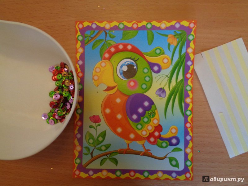 В наборе основа-картинка с попугаем, пайетки и несколько полосочек двустороннего скотча. Аппликация для возраста 3-4 года, но отрезать необходимые кусочки скотча детям такого возраста трудно - нужна помощь взрослого. На основу надо приклеить кусочки скотча, а потом на скотч цветные пайетки. Готовую картинку мы обклеил...