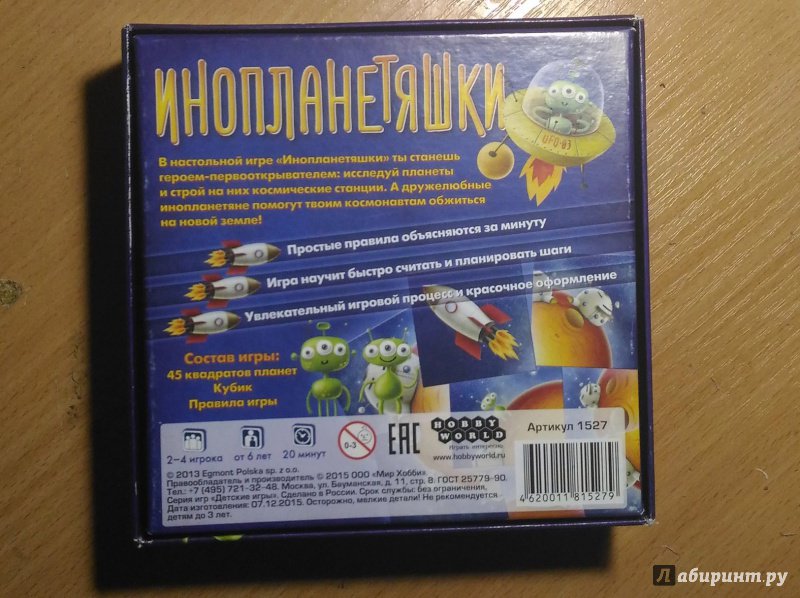 Комплектация: 45 квадратов планет, кубик, правила игры.
