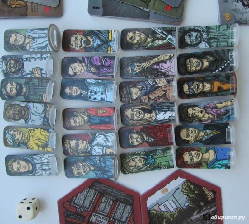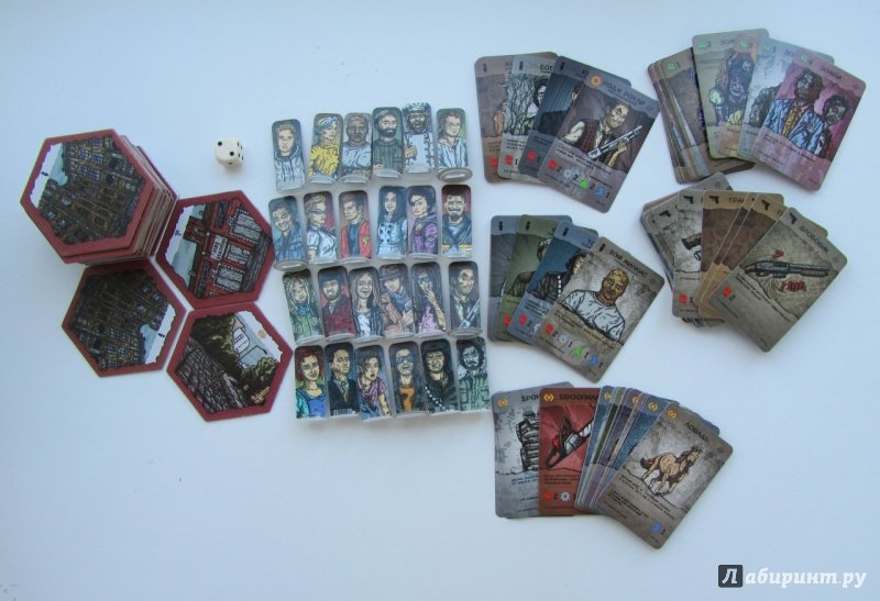 70 маркеров, 24 жетона Бойцов, 24 гексагона карты, 16 карт Целей, 13 карт наемников, 12 карт Событий, 12 карт Гаджетов, 12 карт Огнестрела, 12 карт Холодняка, 12 карт Транспорта, 12 карт Снабжения, 11 карт Зомби, 4 планшета игроков, 1 жетон мародеров, 3 линейки колод, 1 правила, 1инструкция выживальщика.