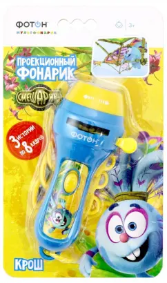 Истории с любимыми персонажами из анимационного полнометражного фильма "Смешарики. Легенда о Золотом Драконе" порадуют не только детей, но и взрослых поклонников. Проекционный фонарик с кассетами "Фотон" - мультфонарик: показывает цветные истории по принципу диапроектора; включает в себя три кассеты с цветными историями по восемь кадров каждая ("Полет на дельтапланах", "Опасная река", "Улучшайзер и Смешарики"); проецирует цветное изображение на поверхность с расстояния от 0,3 м до 4 м; без кассет работает как обычный фонарик. "Ножки" позволяют ставить фонарик на горизонтальную поверхность или использовать его в качестве ночника; имеется кольцо для крепления кассет.