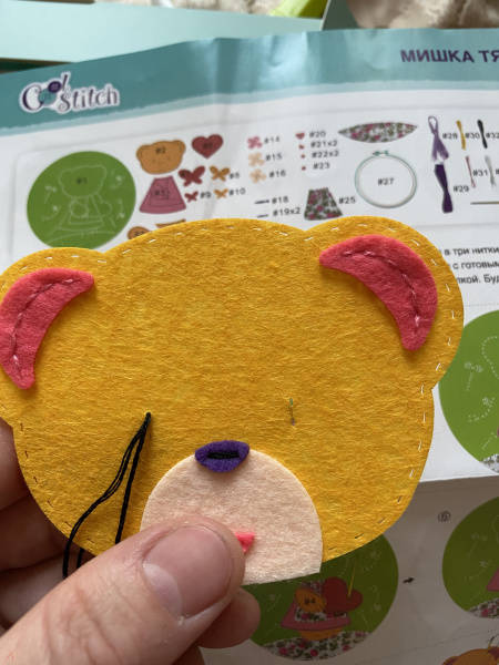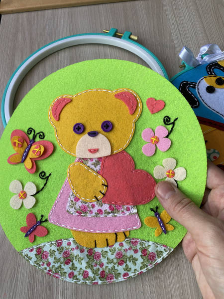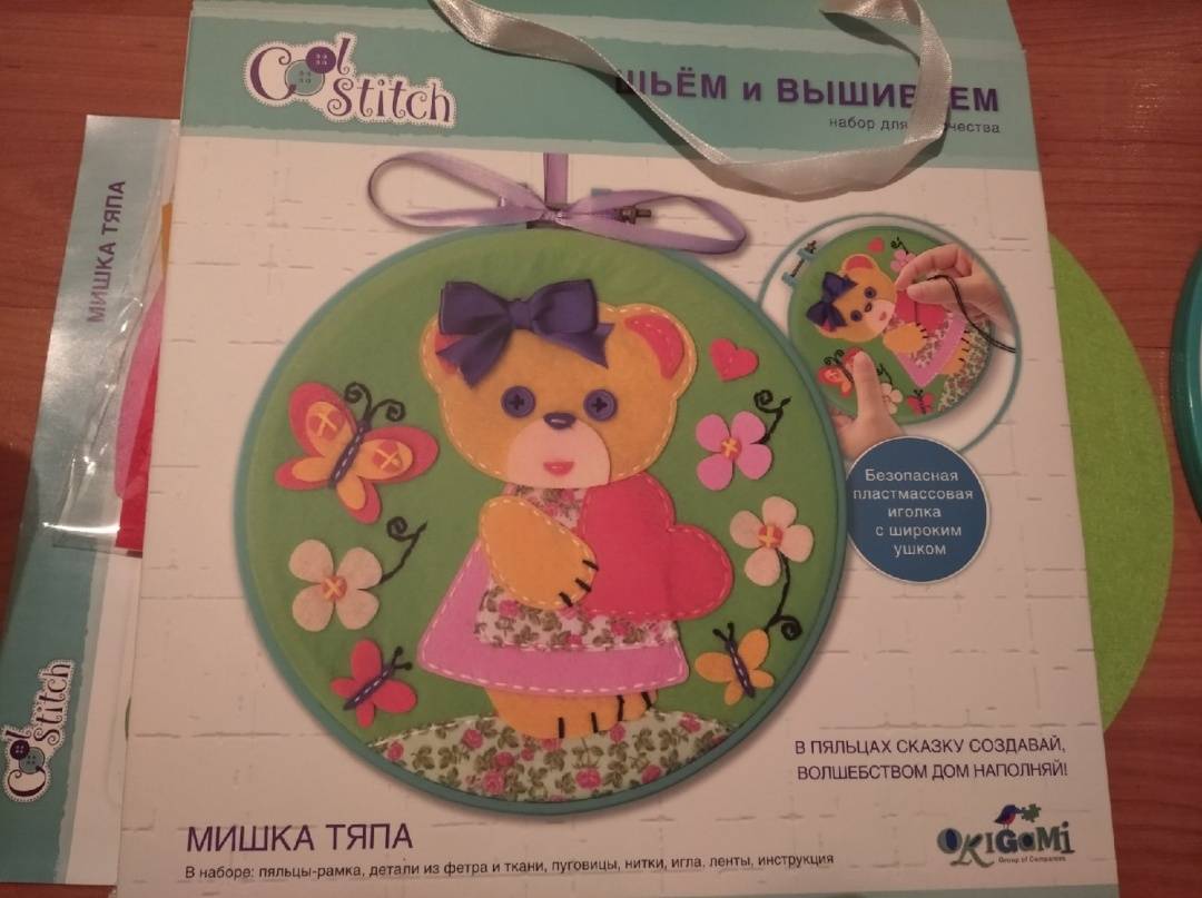 Прекрасный набор для рукоделия. особенно отмечу удобное пяльце, безопасную пластмассовую иголку и качественный не рыхлый фетр для поделки.