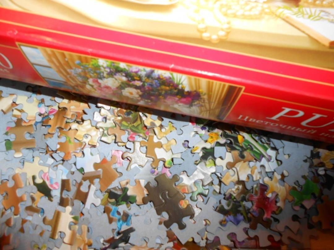 Получила пазлик и начала сборку. Рамка и окно собрались легко, да и букет потихоньку поддается, несмотря на пугающую пестроту.