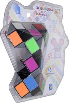 Головоломка Змейка - в разобранном виде представляет собой линию, состоящую из соединенных между собой 48 равнобедренных, разноцветных призм. Призмы соединяются между собой шарнирами и позволяют собирать различные двух- и трехмерные модели: геометрические фигуры, животных и т.д.