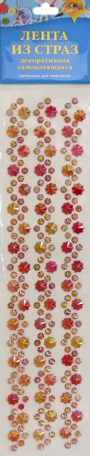 В наборе 3 ленты из страз разной формы, стразы соединенны в общий узор и размещены на клеевой основе.
