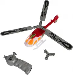 В комплекте: бело-красный корпус военного вертолета, винт, 3 серебристые лопасти с рисунком, пусковое устройство.