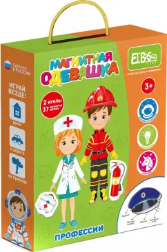 В наборе: 2 куклы, 37 мягких магнитов в виде одежды и аксессуаров, каталог с образами профессий.