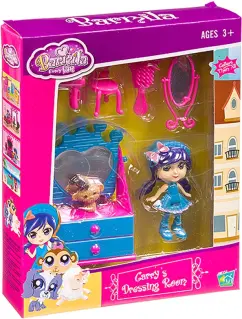 Набор игровой Dressing room. В составе набора - фигурка из ПВХ 8 см. (Кукла, с шарниром по середине - может наклоняться; голова и руки поворачиваются), трюмо с зеркалом, собачка, стульчик, фен, расчёска, зеркальце.