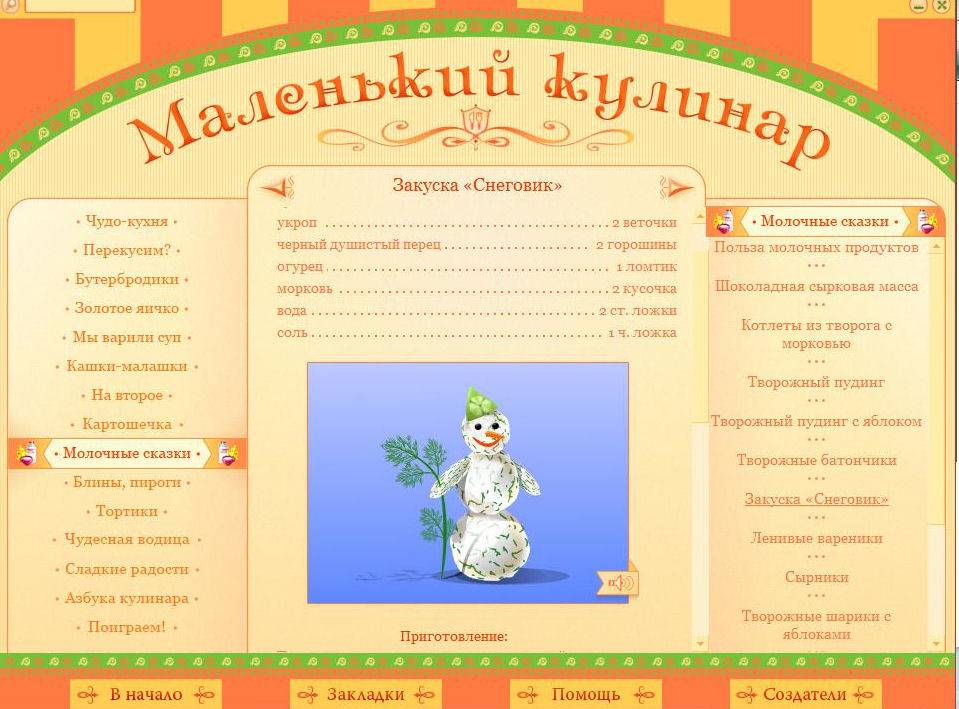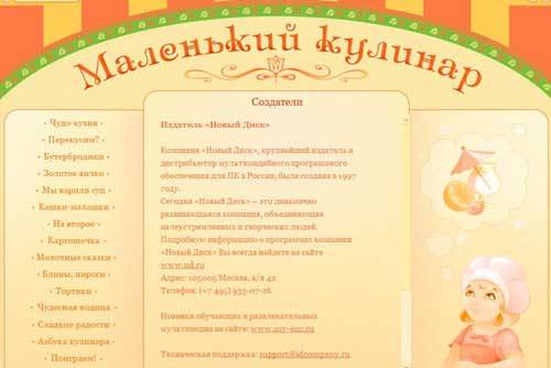 Диск "Маленький кулинар" будет интересен и взрослому и ребенку! Простой и удобный интерфейс. Множество рецептов и варианты оформления блюд. Понравившиеся блюда можно добавить в закладки или распечатать(полезная функция) Помимо рецептов, дается подробная информация о продуктах (напр: ск.весит куриное яйцо, да...