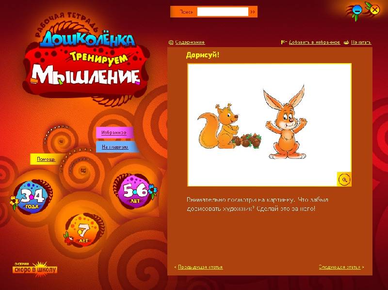 Этот мультимедийный диск содержит готовые материалы для развития всех форм мышления у детей от 3 до 7 лет. Они будут проводить почти настоящие эксперименты, которые способствуют развитию наглядно-действенного мышления: найдут, кому принадлежит отпечаток, выяснят, какие предметы тонут, а какие нет, соберут пирамиду из предметов разной формы и т. д. Малыши дорисуют картины, нарядят елку, найдут все отличия в рисунках и выполнят многие другие творческие задания, которые помогут им развить наглядно-образное мышление. Научиться обобщать, анализировать, сравнивать ребятам позволят специальные игры и загадки. А в процессе веселой игры мальчишки и девчонки незаметно для себя будут готовиться к школе!