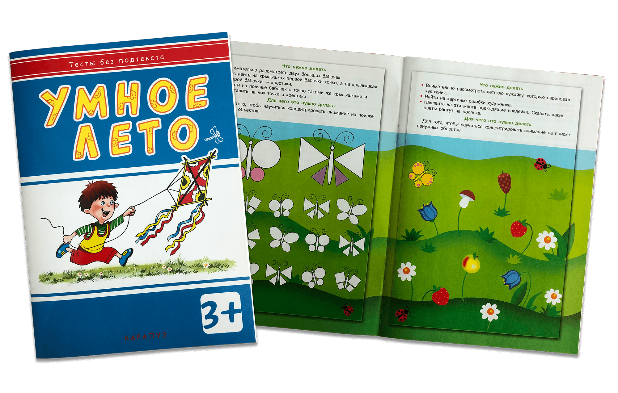 Книга «Умное лето» И.В. Мальцевой раскрывает сезонную тематику с помощью специальных заданий, которые учат детей умению сравнивать, сопоставлять, группировать различные объекты, находить закономерности в ряду предметов в зависимости от их цвета, величины, формы и назначения, упражняют в количественном и порядковом счете. Например, ребенку предлагается рассмотреть две яблони и сказать, одинаковые они или разные, раскрасить картинки так, чтобы они получились одинаковыми, сосчитать отличия (если они есть) между двумя яблонями. Каждое упражнение сопровождает лаконичное объяснение цели задания — для чего это нужно делать. Это поможет взрослым методически грамотно выстроить работу с ребенком и выявить его склонности.