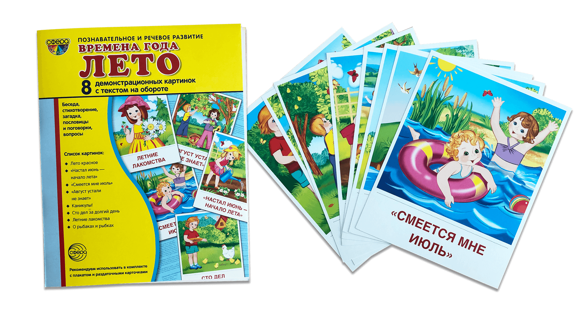 Для познавательного и речевого развития «ТЦ Сфера» предлагает использовать демонстрационные картинки. Так, комплект тематических наглядных материалов «Времена года. Лето» содержит 8 карточек, на лицевой стороне которых приводятся яркие иллюстрации, а на обороте — рассказы о понятиях, связанных с летним периодом. Детям предлагается объяснить пословицы и поговорки, отгадать загадки, вместе со взрослыми заняться интеллектуальными речевыми играми. Например, на карточке «Смеется мне июль» рассказывается, что в этом месяце расцветают душистая липа и многие лекарственные травы, детям предлагается поразмышлять над значением таких пословиц, как «В июле солнце без огня горит», «Что летом родится, то зимой пригодится».