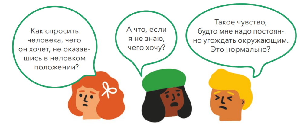 2. Согласие и другие люди — эта часть книги научит уважать чужие границы и находить компромиссы во всех сферах жизни, включая очень важную и интимную — сексуальную (просить и спрашивать, здороваться, договариваться в группе).