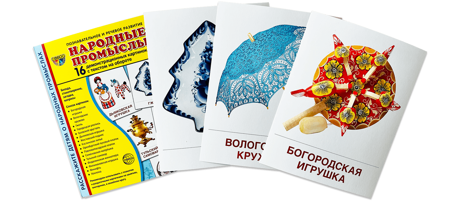 Комплекты из 16 демонстрационных карточек с текстом на обороте «Народы России», «Народные промыслы» из серии «Сфера картинок» состоят из бесед, стихотворений, загадок и вопросов по теме. Это довольно известная серия издательства, к каждому комплекту при желании можно докупить плакат формата А2 и раздаточные карточки. Это удобно в работе с группой детей, на тематических занятиях и викторинах. В домашних условиях достаточно иметь просто комплект и беседовать с ребенком по картинкам. Знакомясь с демонстрационными картинками, ребенок сможет отгадать загадку, выучить стихотворение, ответить на вопросы по теме. Текст на обороте каждой картинки написан доходчивым языком и служит для взрослого