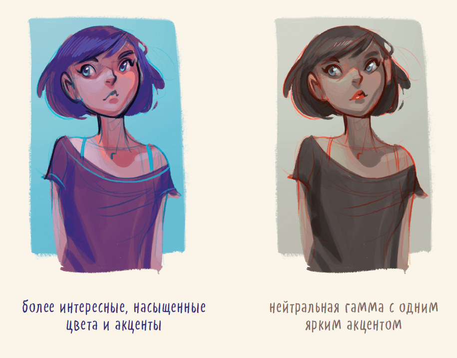 Рисование цветных эскизов — отличный способ попробовать разные сочетания цветов. Вы удивитесь тому, какие цвета убедительно передают натуру — гораздо более яркие, чем ожидаешь. Подбор телесных оттенков — тоже хорошая практика. Цвет кожи бывает насыщенным и теплым или нейтральным и холодным. По опыту я знаю, что главную роль в восприятии цвета играют блики и тени.