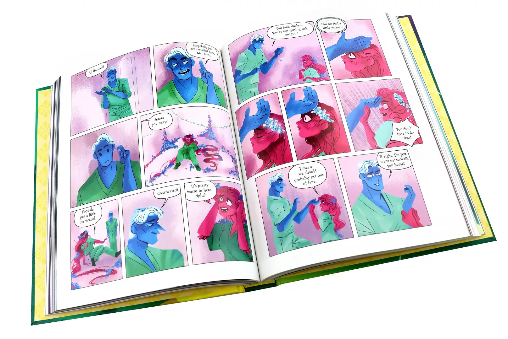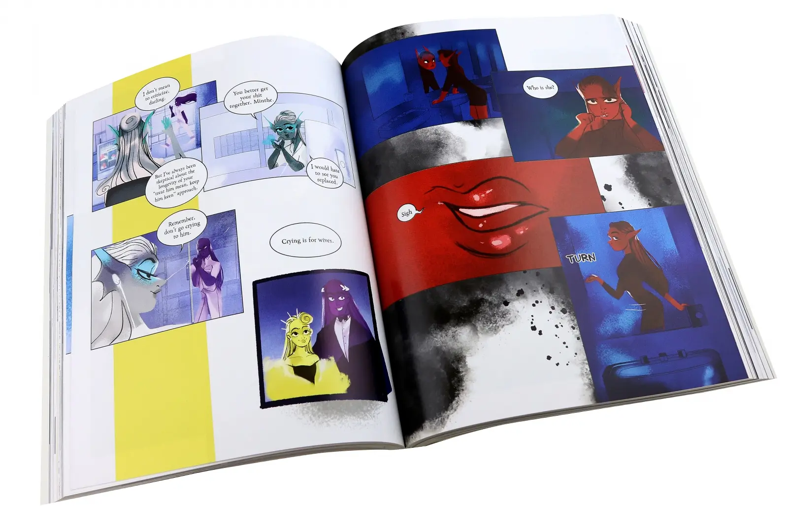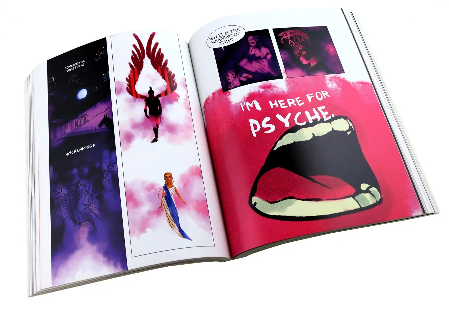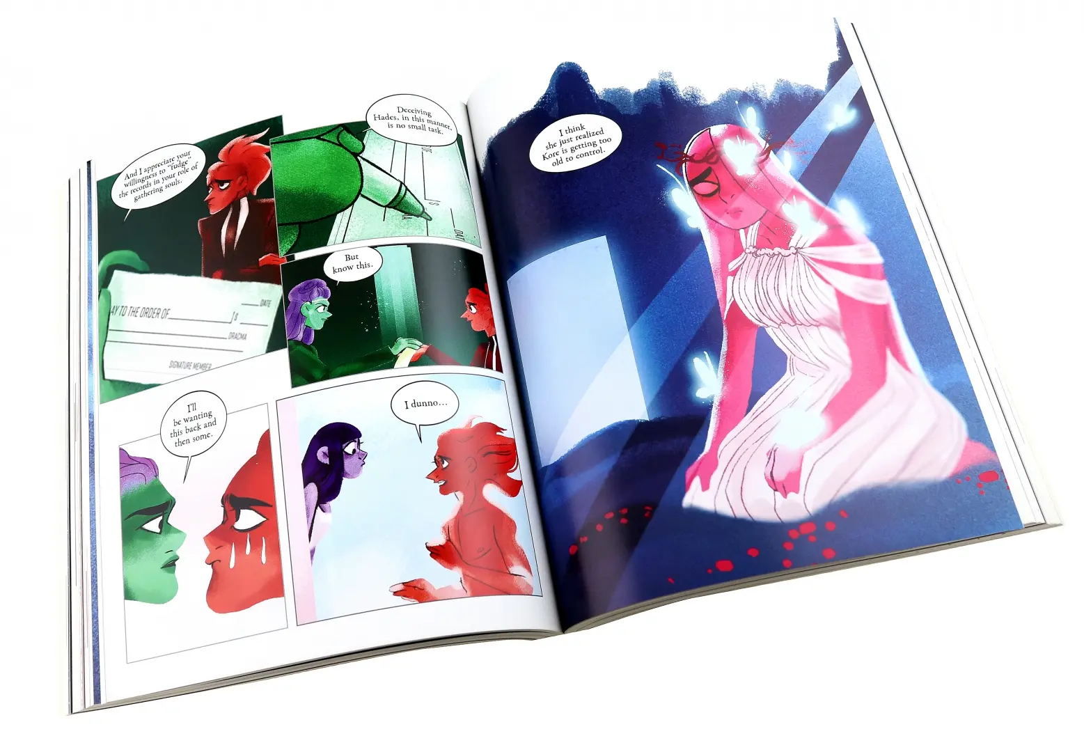 Аид с синей кожей вполне прижился в массовой культуре после того, как именно таким его показали в диснеевском «Геркулесе». В «Преданиях Олимпа» все боги разноцветные: Аид традиционно мертвенно-синий, наивная жизнелюбивая Персефона — розовая, а, например, фигура Геры окрашена оранжевым. Вместе с эффектами, усиливающими эмоциональное впечатление и делающими комикс таким кинематографичным (вроде монтажных склеек или наезда камеры), цвет создает особую атмосферу. Графический роман напоминает одновременно и сериал «Эйфория» то нежными, то едва ли не неоновыми оттенками, переливом блёсток и эстетизацией даже самых тяжелых моментов, и отсылает к первоисточнику: например, начинается он нетривиально — с цитаты из Гесиода.