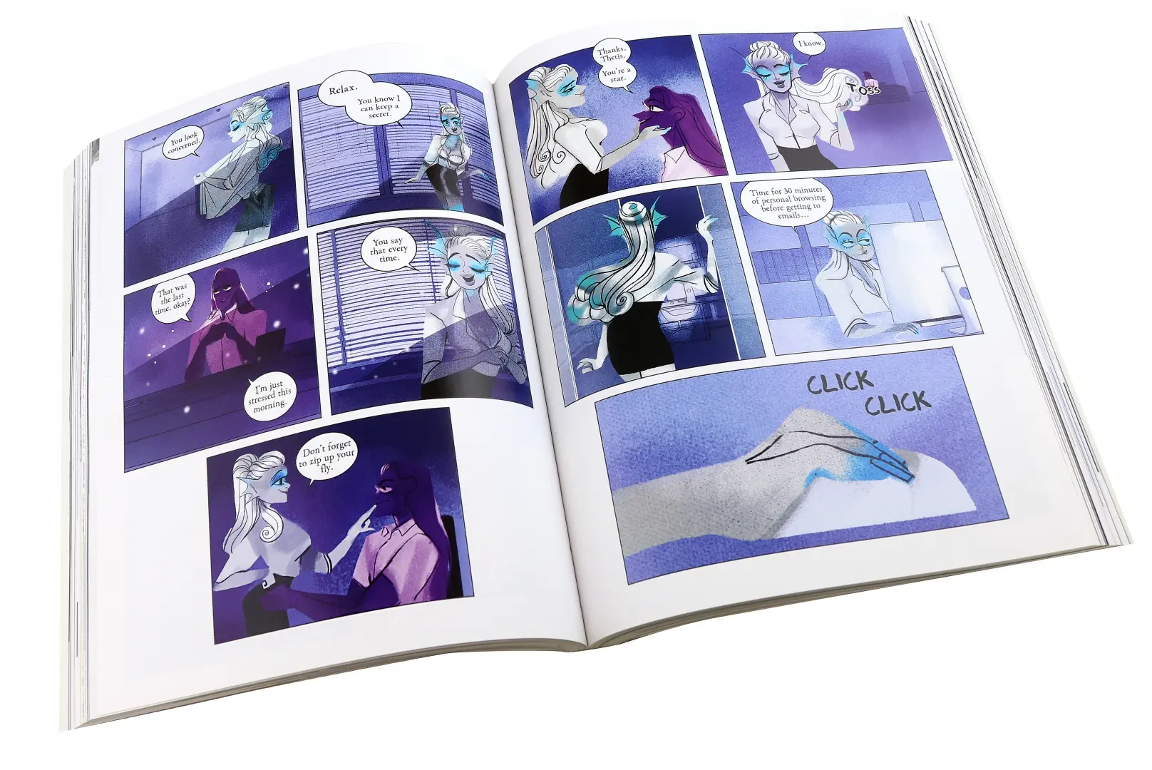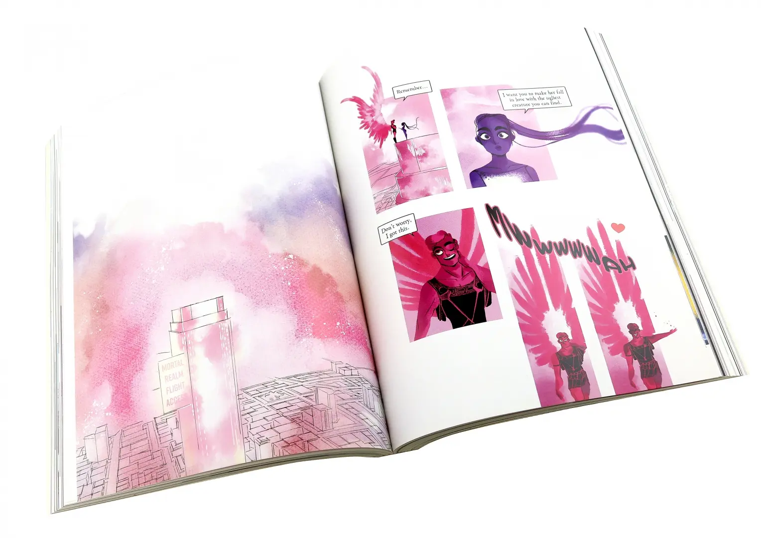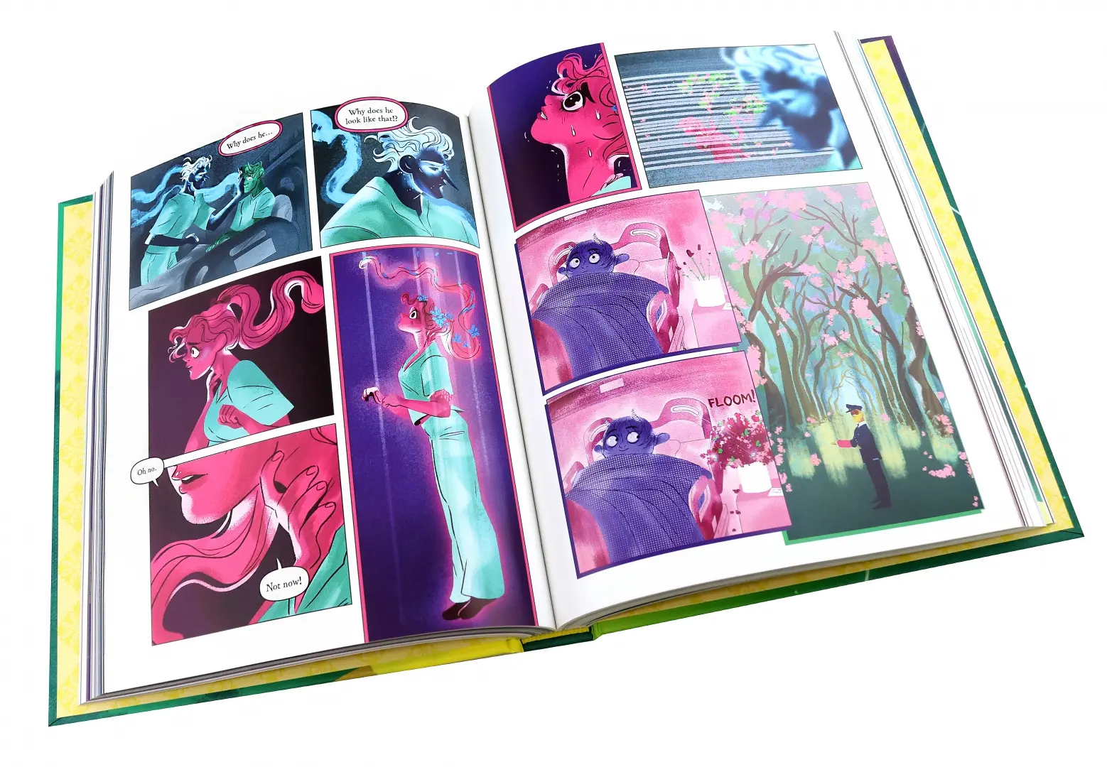 Аид с синей кожей вполне прижился в массовой культуре после того, как именно таким его показали в диснеевском «Геркулесе». В «Преданиях Олимпа» все боги разноцветные: Аид традиционно мертвенно-синий, наивная жизнелюбивая Персефона — розовая, а, например, фигура Геры окрашена оранжевым. Вместе с эффектами, усиливающими эмоциональное впечатление и делающими комикс таким кинематографичным (вроде монтажных склеек или наезда камеры), цвет создает особую атмосферу. Графический роман напоминает одновременно и сериал «Эйфория» то нежными, то едва ли не неоновыми оттенками, переливом блёсток и эстетизацией даже самых тяжелых моментов, и отсылает к первоисточнику: например, начинается он нетривиально — с цитаты из Гесиода.