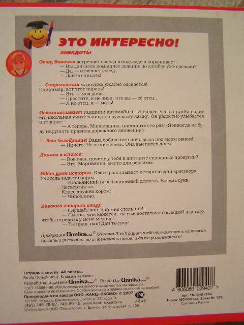 Веселая тетрадка с синей клеткой и красными полями. Странички белые, писать удобно. Обложка картонная, картон достаточно плотный. Рисунок лакированный. На фото этого не видно, а в действительности на обложке по всему белому фону идут белые лакированные надписи Smile. На обороте обложки анекдоты про Вовочку.
