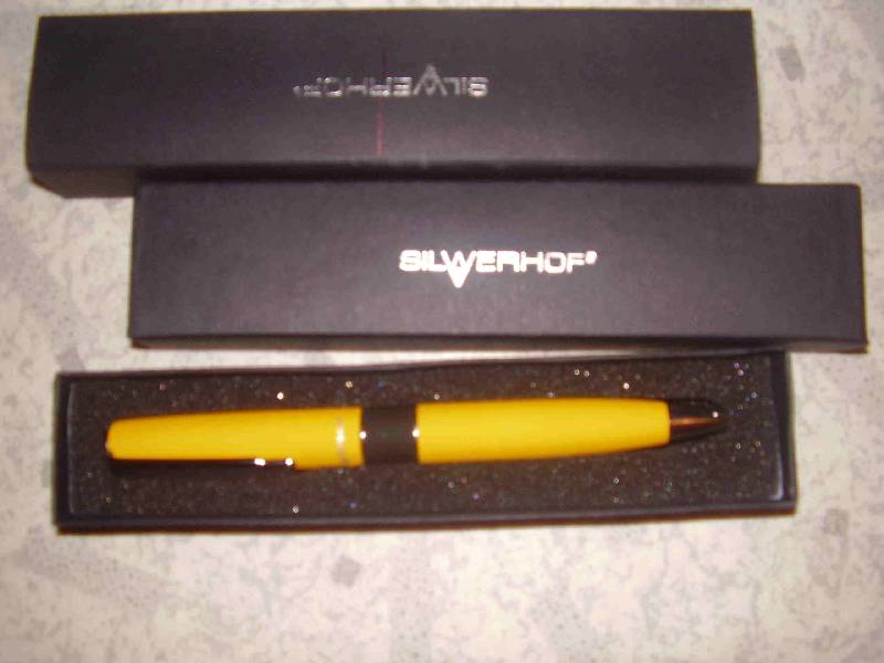 Мне ручка пришла почему-то желтая, т.к. заказывала в подарок мужчине, я немного расстроилась. Корпус прорезиненный, не облезет и не затрется, металлические тонкие блестящие вставки, поворотный механизм, стержень заменяется, шариковая, чернила темно синие, линия толстая. Коробка черная картонная, вставляется в такой же...