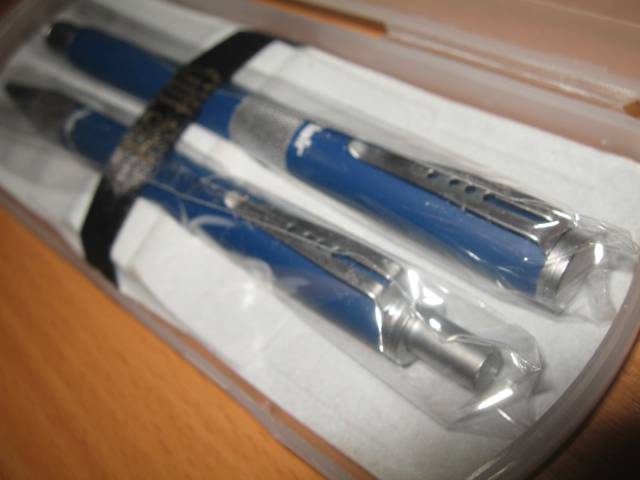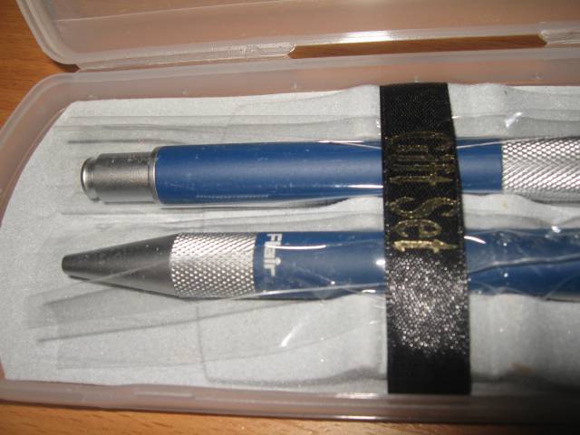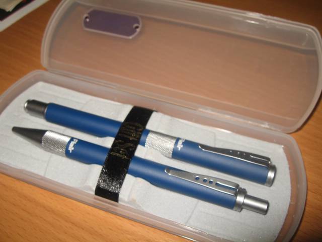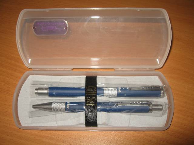 Набор подарочных ручек находится в полупрозрачном пластмассовом футляре. Сам футляр упакован в выдвижную картонную коробочку(она изначально была какая-то заляпанная, перед тем как подарить, сняла, выбросила).