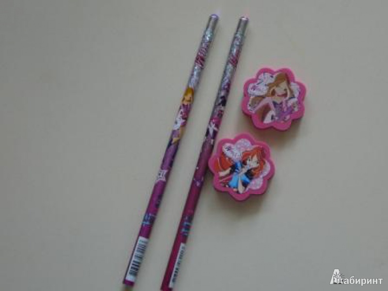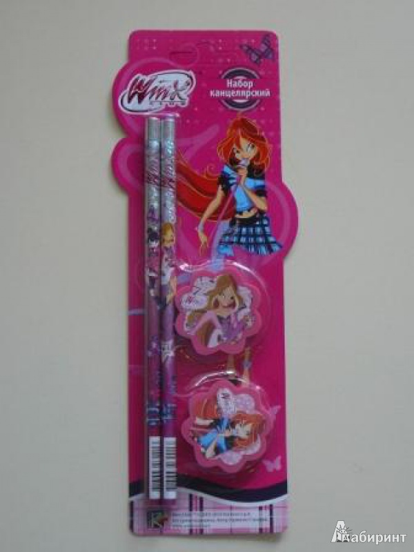 Хороший канцелярский набор для любительниц WINX: в него входят 2 чернографитных карандаша и 2 ластика. Карандаши очень красивые - обернуты в голографическую пленку и страза наверху, стержень при заточке не поломался. Ластики тоже симпатичные, стирают хорошо. Моя дочка очень довольна!