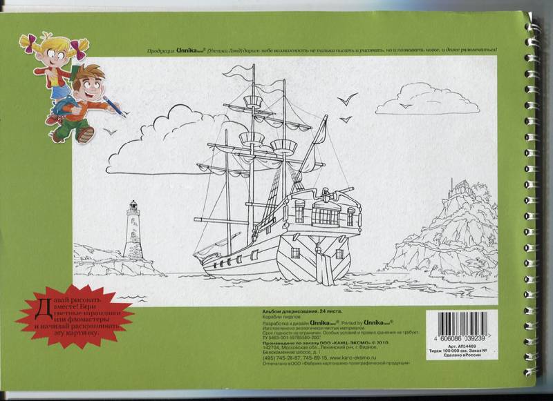 Бумага сероватая и рыхловата. Но для карандаша дошкольника - подойдет. На задней стороне обложки есть раскраска. Тема наша любимая - пираты и корабли.