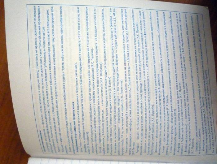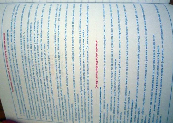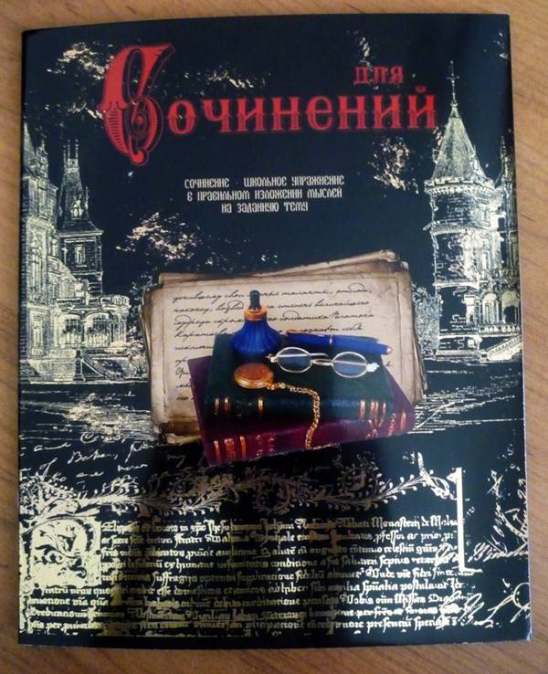 Тетрадь глянцевая, рисунок нанесен золотом, когда фотографировала я отражалась в тетради. Но она еще и пачкается.На первом листе место для указания личных данных, потом идут советы по написанию сочинений и словарь литературоведческих терминов. Тетрадь в линию. В конце опять справочный материал: внесюжетные элементы, и...