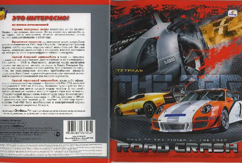 Листы у тетради белые, в слабо сиреневую клетку, имеются поля. На задней обложке приведены некоторые факты об автомобилях.