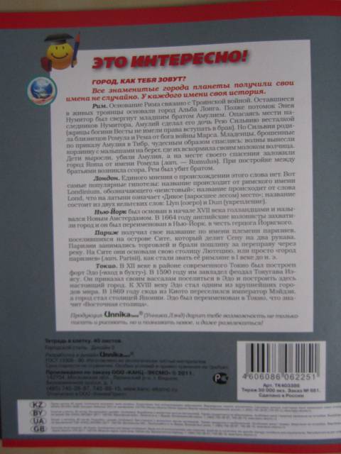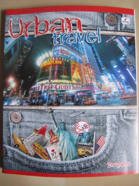 Тетрадь с обложкой "Города мира", в нашем случае -Нью-Йорк,к которой художник подошел немного с юмором, нарисовав символами Нью-Йорка хот-дог,кофе,Кадиллак,виски,газету Нью-Йорк Таймс и т.д.На обратной стороне факты происхождения названий таких городов, как Рим,Париж,Лондон,Токио. Интересно.