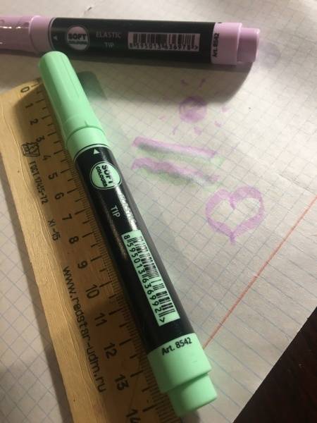 Текстовыделитель хороший. Цвет нежно-фиолетовый, очень красивый. Маркер оооочень мягкий. Пришёл раньше срока )