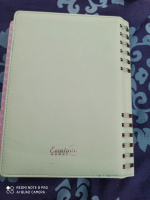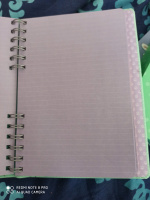 Когда увидела на сайте, влюбилась с первого взгляда. На деле пришел очень неопрятный, неряшливый блокнот. Везде клей, царапины, разводы. Внутри листы трех цветов, тонкие, гладкие. Форзацы с лапками, очень мило. Но всё равно не жалею, что купила. Обложка чем-то напоминает ПВХ или кож. зам., очень приятная на ощупь.