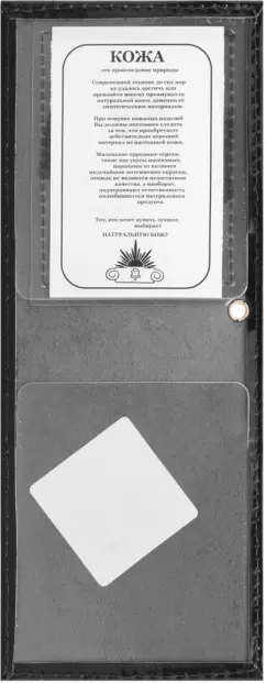 Модель выполнена из натуральной гладкой кожи черного цвета. Снабжена противокражным элементом. Имеет один карман и окно на передней стенке обложки. Благодаря компактным размерам 10х70х110 мм удобно всегда носить с собой.
