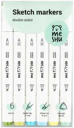 Набор двусторонних маркеров для скетчинга Meshu - идеальный выбор для художников, дизайнеров, иллюстраторов и любителей скетчинга, подходят для создания анимэ и манги. Эргономичный трехгранный корпус удобно лежит в руке и позволяет эффективно прорабатывать мелкие детали рисунка. Чернила на спиртовой основе - быстро высыхают, водостойкие, нетоксичны и не портят поверхность бумаги. Маркеры обладают пулевидным (2 мм) и скошенным (6 мм) наконечниками, толщина линии 1.0-7.0 мм, что позволяет прорабатывать как мелкие детали рисунка. так и закрашивать большие области.