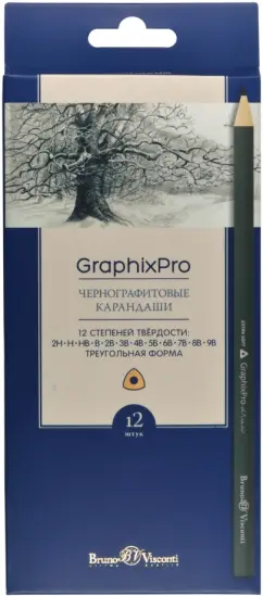 Набор состоит из 12 карандашей различной степени твердости: 2Н-9В.