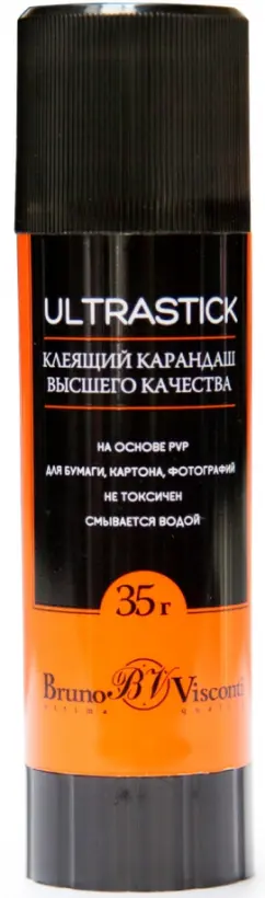 Клеящий стик "UltraStick" в упаковке объемом 35 грамм. Безопасный и нетоксичный клей-карандаш для бумаги и картона. Равномерно и аккуратно наносится на поверхность и прочно соединяет бумажные элементы. Время высыхания достаточно короткое, 30-40 секунд. Тем не менее, этого вполне достаточно, чтобы поправить неточности. Это водорастворимый клей. Он легко отстирывается и смывается с рук и рабочих поверхностей обычной водой. Упакован в пластиковую тубу с выдвижным механизмом-дозатором. Плотно закрывается колпачком. Если не оставлять клей открытым, прослужит долго, не высыхая. Незаменимая вещь в любом доме и офисе.
