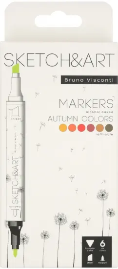 Великолепный набор скетч-маркеров Sketch&Art. Осенний пейзаж. В белой картонной коробке с покрытием SoftTouch подобраны 6 оттенков двусторонних маркеров для создания рисунков в теплых тонах осеннего пейзажа,