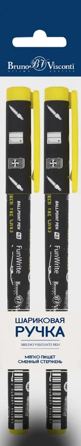 Ручки "FunWrite" от Bruno Visconti обладатели таких характеристик: бархатистое покрытие Soft Touch, немецкое качество чернил Dokumental и пишущий узел Premec (Швейцария). Корпус изготовлен из ABS-пластика, который гнется при ударе или сильном нажиме, но не ломается. Оригинальный дизайн ручки как "вишенка на торте" - дополнительная характеристика, не позволяющая отказаться от ее обладания.