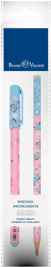 Ручка шариковая HappyWrite, синяя и карандаш чернографитный ArtGraphix. Единорожки в облачках, HB